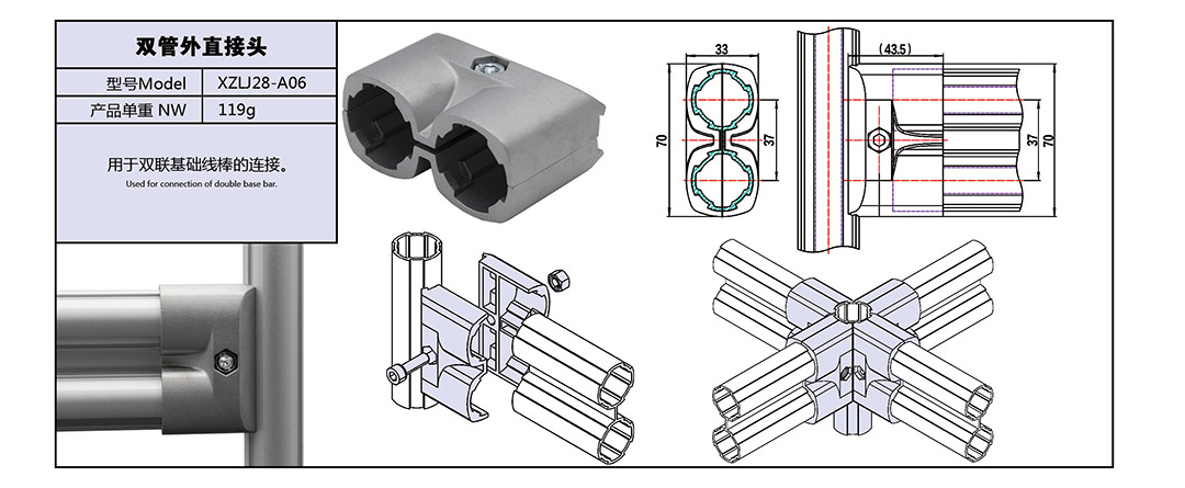 定制:鋁管接頭 雙管外直接頭 XZLJ28-A06